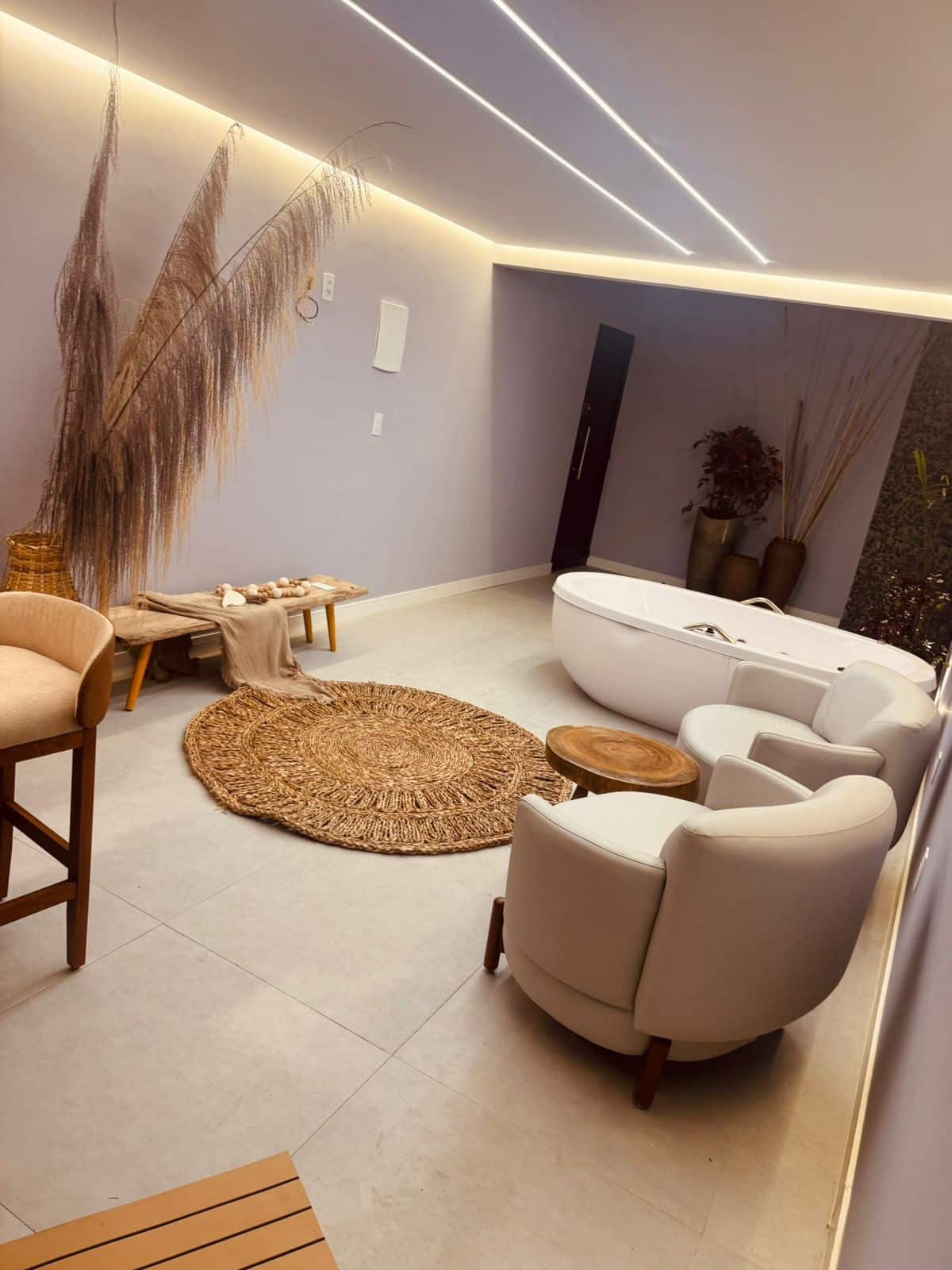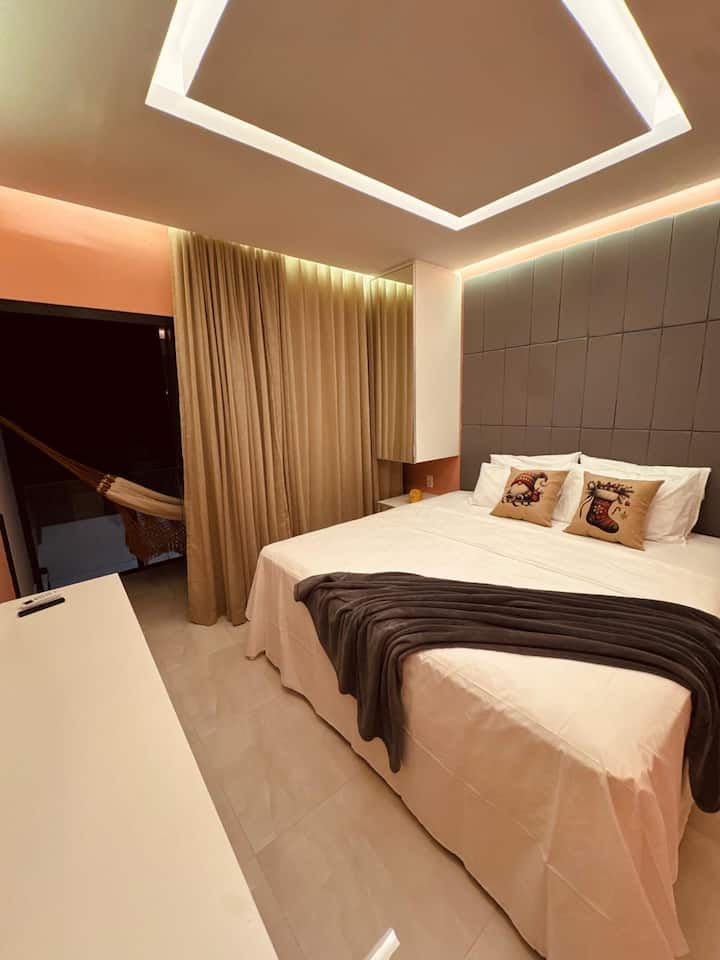 Nossos lofts duplex foram projetados para elevar o conceito de conforto e lazer privativo. No térreo, você encontrará uma sala de estar acolhedora equipada com TV, integrada a uma cozinha completa e funcional. O grande destaque deste andar é a sua banheira de hidromassagem exclusiva, estrategicamente posicionada ao lado da sala para proporcionar relaxamento profundo com total privacidade. Para complementar a experiência, cada flat dispõe de um chuveiro externo privativo, ideal para um banho refrescante ao ar livre após um dia de mar.