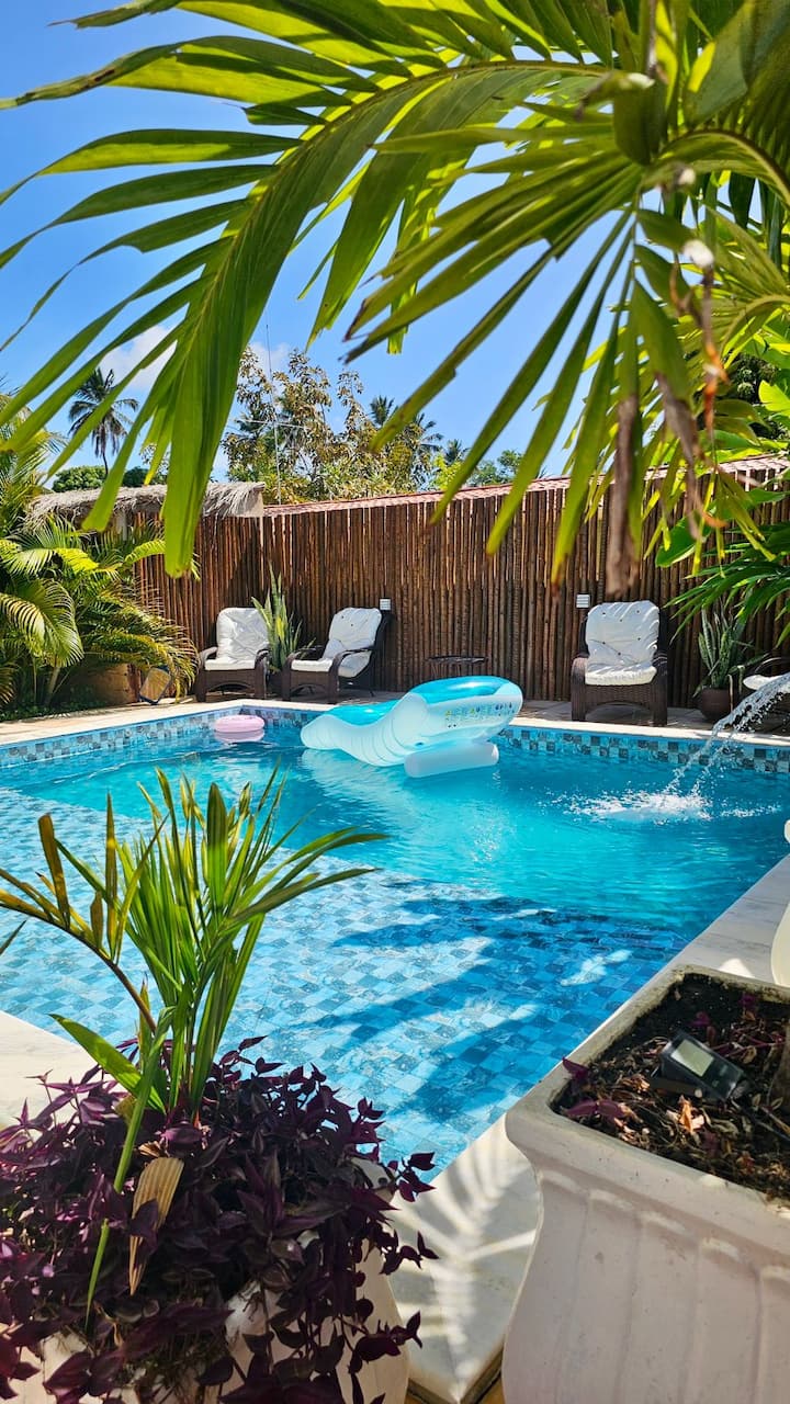 Ao subir para o segundo andar, o ambiente se transforma em um santuário de descanso: uma suíte master climatizada, equipada com uma grande Smart TV e uma cama de dimensões generosas. O conforto é garantido por nosso enxoval premium, que inclui toalhas macias específicas para banho, além de toalhas exclusivas para o uso na hidromassagem e na piscina da pousada. Para sua conveniência, oferecemos itens básicos de higiene e um frigobar com opções de bebidas variadas. RESERVE CLICANDO AQUI